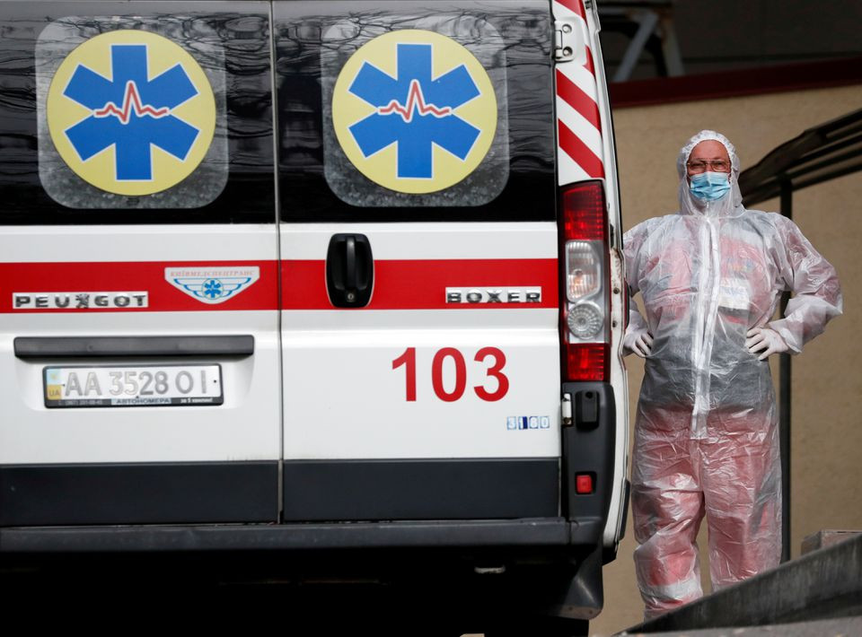 ޔޫކްރެއިންގެ ހޮސްޕިޓަލެއްގެ ކައިރީގައި، ސިއްހީ މަސައްކަތްތެރިއަކު މަޑުކޮށްލައިގެން