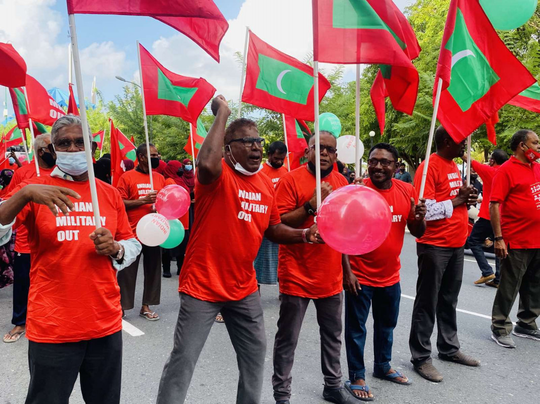A loose translation of the rally’s title “Maldivians in defense of independence”, protestors called to defend the country’s independence, holding up banners reading “India Out” and “Defend Maldives”.