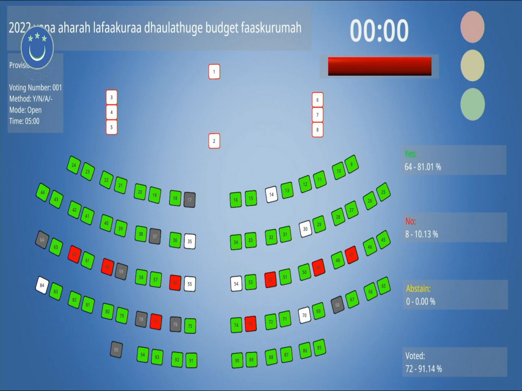 ބަޖެޓް ދިރާސާކޮށް ނިންމުމަށްފަހު އެކުލަވާލި ކޮމިޓީ ރިޕޯޓަށް މެމްބަރުން ވާހަކަދެއްކެވުމަށްފަހު ވޯޓަށް އެހީ ބުދަ ދުވަހުގެ ޖަލްސާގައެެވެ. ވޯޓަށް އެހުމަށް ތައްޔާރުވަމުން ދިޔައިރު، ތަޅުމުގައި ނައިފަރު ދާއިރާގެ މެމްބަރު ގެންދެވީ މިއީ ގައުމު ބަނގުރޫޓްކުރާ ބަޖެޓެއް ކަމަށް ވިދާޅުވެ އަޑުގަދަ ކުރައްވަމުންނެވެ. ބަޖެޓަށް ވޯޓް ދެއްވުމަށް އެމްޑީޕީގެ ޕީޖީން ވަނީ ވިޕް ލައިނެއް ނެރެފައެވެ. އަދި މެމްބަރުން ތަޅުމަށް ހާޒިރުވެ ވޯޓުގައި ބައިވެރިވެވަޑައިގަތުމަށްވެސް އެދިފައެވެ. ބަޖެޓް ފާސް ކުރުމަށް 64 މެމްބަރުން ވޯޓު ދެއްވިއިރު، އިދިކޮޅަށް ވޯޓު ދެއްވީ 8 މެމްބަރުންނެވެ. ވޯޓުގައި ބައިވެރިވެ ވަޑައިގެންނެވީ، 72 މެމްބަރުންނެވެ.