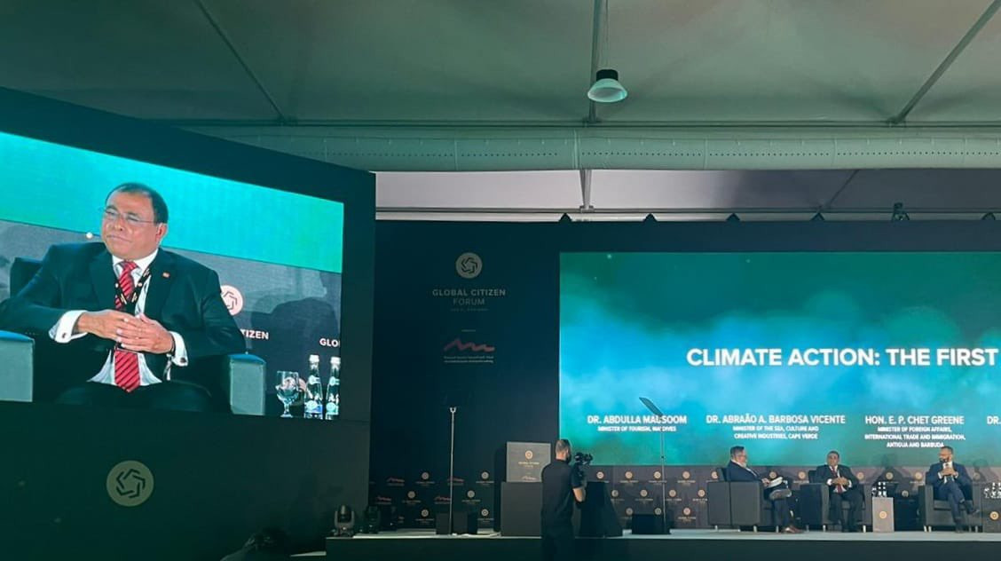 ޔޫއޭއީގެ ރަސް އަލް-ޚައިމާގައި ކުރިއަށްގެންދިޔަ ގްލޯބަލް ސިޓިޒަން ފޯރަމްގައި ވާހަކަފުޅުދައްކަވަމުން މިނިސްޓަރ މައުސޫމް ވިދާޅުވީ ރާއްޖޭގެ ފަތުރުވެރި ކަމަށް ދިމާވެފައިވާ އެންމެ ބޮޑު އެއް ގޮންޖެހުމަކީ މޫސުމީ ބަދަލުތަކުގެ ސަބަބުން ލިބެމުންދާ ގެއްލުންތަކެވެ. މުޅި ދުނިޔެއަށްވެސް ކުރިމަތިވެފައިވާ އެންމެ ބޮޑު މައްސަލައަކީ ދުނިޔެ ހޫނުވުމުގެ މައްސަލަ ކަމަށާއި މޫސުމީ ބަދަލުތަކާ ދެކޮޅަށް މަސައްކަތް ކުރުމަށް ކުދި ޖަޒީރާ ޤައުމުތަކަށް ބޮޑެތި ޤައުމުތަކުގެ ފަންނީ އެހީ ބޭނުންވާ ކަމަށް ވެސް ވިދާޅުވިއެވެ.