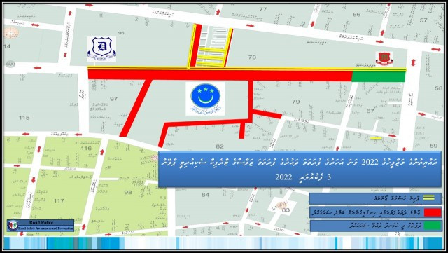 ބުރާސްފަތި ދުވަހުގެ ފަތިހު 05:45ން ފެށިގެން ޖަލްސާ ނިމެންދެން، އެސަރަހައްދުގެ މަގުތައް އާންމު ދަތުރުފަތުރަށާއި ހިނގާ މީހުންނަށް ބަންދުކުރުމަށް ވަނީ ހަމަޖެހިފައި