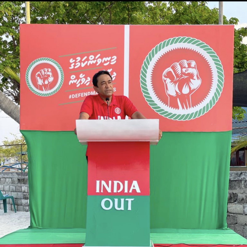 އެގޮތުން އަމިއްލަ ގޭގޭގައިވެސް އިންޑިއާ އައުޓް ޖެހުމަށް ރައީސް ޔާމީން ގޮވާލައްވާފައިވާއިރު، މިއީ ސިޔާސީ ގޮތުން ވަކި މަގުސަދެއް ހާސިލު ކުރުމަށް ހިންގަމުން ގެންދާ ހަރަކާތެއްގެ ގޮތުގައި ގިނަ ބަޔަކު ދަނީ ސިފަ ކުރަމުންނެވެ. އަދި އިންޑިއާ އައުޓްގެ ނަމުގައި ޕެޓިޝަނެއްގައި ސޮއިކުރުންވެސް ކުރިއަށް ގެންގޮސްފައިވާއިރު މި ޕެޓިޝަންގައި ބުނަނީ މި ސަރުކާރުން އިންޑިއާއާއެކު ސިއްރު އަސްކަރީ އެއްބަސްވުންތަކެއްގައި ސޮއިކުރަމުން ގެންދާ ކަމަށެވެ. އަދި ގާނޫނުއަސާސީއާ ޚިލާފަށް ރާއްޖޭގެ ތަންތަން އިންޑިއާއަށް ދޫކޮށްފައިވާކަމަށެވެ.