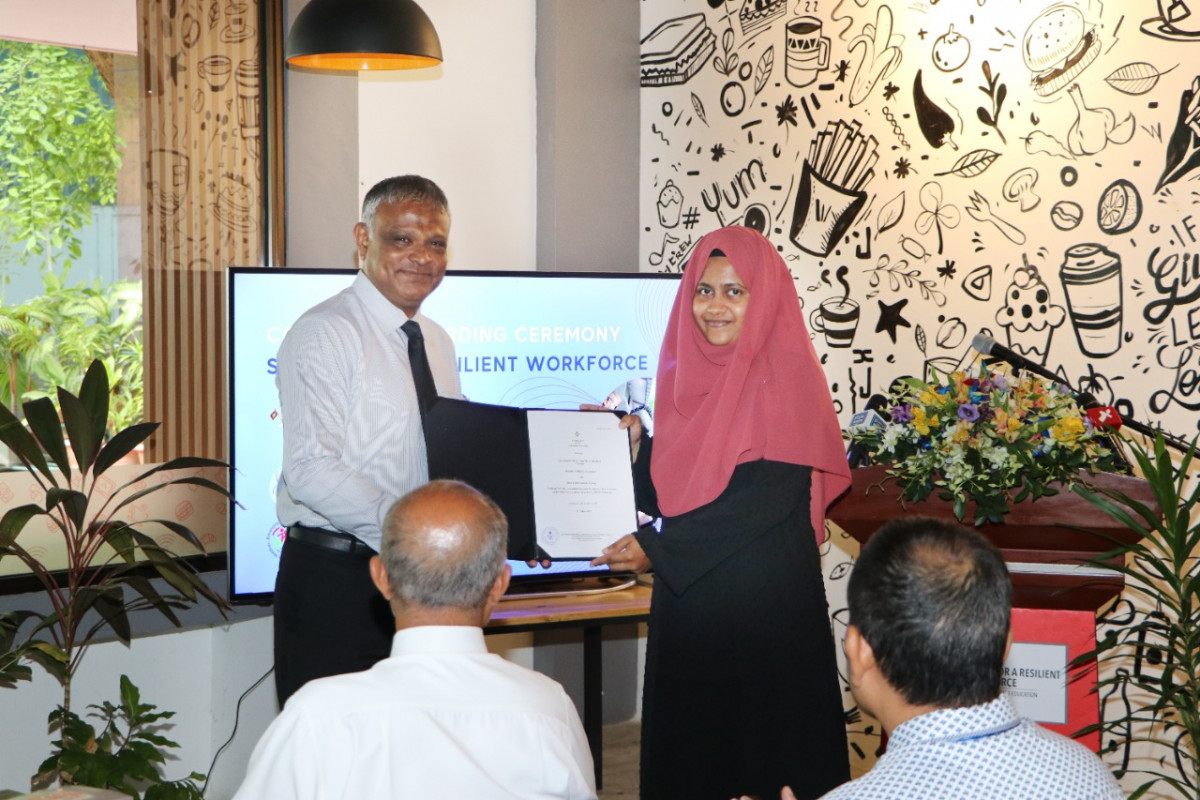 ކޮވިޑްގެ ހާލަތުން ދިވެހިރާއްޖެ އަރައިގަނެ އިގްތިސާދު އަލުން ނެގެހެއްޓުމަށްޓަކައި ޒުވާނުންނަށް ޚާއްސަކޮށްގެން ހިންގަމުންދާ ސްކިލްސް ފޮރ އަ ރެޒެލިއެންޓް ވޯރކްފޯސް ޕްރޮގްރާމްގެ ދަށުން ޓެކްނިކަލް އަދި ވޮކޭޝަނަލް ދާއިރާއިން އިތުރު 35 ކޯހަކުން 1،400 ދަރިވަރުން ތަމްރީނު ކުރުމަށް އަމިއްލަ ފަސް ފަރާތަކާއި ހަވާލު ކޮށްފައިވަނީ މިކަމަށްޓަކައި ބޭއްވެވި ޚާއްސަ ހަފްލާއެއްގައެވެ. މި ހަފްލާފައި އެއްބަސްވުންތައް ހަވާލުކޮށްދެއްވީ މިނިސްޓަރ އޮފް ހަޔަރ އެޑިޔުކޭޝަން ޑރ. އިބްރާހީމް ހަސަނެވެ.