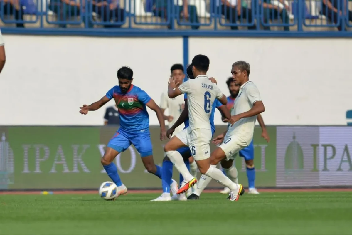 ބުދަ ދުވަހު ހަވީރު އުޒްބަކިސްތާނުގެ މަރްކަޒީ ސްޓޭޑިއަމްގައި ތައިލެންޑް އާއި ވާދަކުރި މެޗުން ރާއްޖެ ބަލިވީ 3-0ންނެވެ. މެޗު ފެށިގެން ތައިލެންޑު ޓީމުން އެޓޭކިން ގޭމެއް ކުޅުނުއިރު، ރާއްޖެ ކުޅުނީ ވަރަށް ބޮޑަށް ފަހަތަށް ޖެހިގެންނެވެ. ފުރަތަމަ ހާފުގައި ތައިލެންޑުން ގިނަ ހަމަލާތަކެއް އުފެއްދިއިރު އެޓީމުން ފުރަތަމަ ލީޑު ނެގީ މެޗުގެ 40 ވަނަ މިނެޓުގައެވެ. މިއީ ތައިލެންޑުގެ ކެޕްޓަން ތީރަތޯން ބުންމަތަން ނަގައިދިން ހުރަހެއް ބޮލުން ޖަހާ ގޯލުގެ ތެރެއަށް ފޮނުވާލައިގެން ސަރާޗް ޔޫޔެން ކާމިޔާބުކޮށްދިން ލަނޑެކެވެ. ފުރަތަމަ ހާފުގެ އިތުރު ވަގުތުގައި ތައިލެންޑުން ލަނޑެއް ޖަހާ ލީޑު ފުޅާކުރިއެވެ. މި ލަނޑު އެޓީމަށް ކާމިޔާބުކޮށްދިނީ ތީރަސީލްއެވެ.