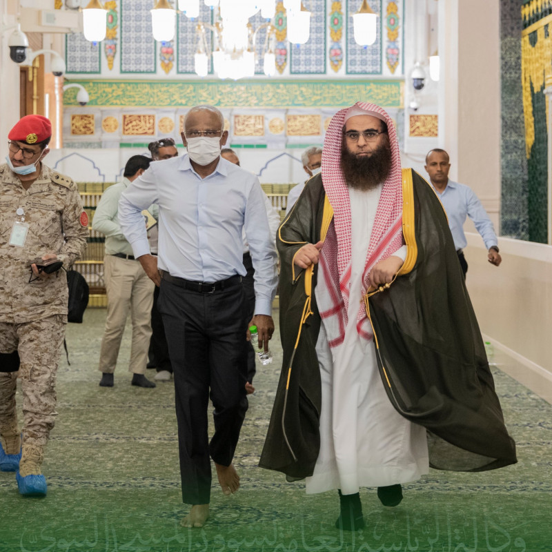 މަސްޖިދުއް ނަބަވީއަށް ކުރެއްވި ޒިޔާރަތުގައި އެމަނިކުފާނަށް މަރުޙަބާ ދެންނެވީ އެސިސްޓެންޓް ޖެނެރަލް ޕްރެޒިޑެންޓް ފޯރ ދަ އެފެއާޒް އޮފް ދަ ޕްރޮފެޓްސް މޮސްކު ޑރ.މުޙައްމަދު އަލް ޚުދައިރީއެވެ. ރައީސް އަރިހުގައި ކޮމިޝަނަރ އޮފް ޕޮލިސް މުޙައްމަދު ޙަމީދުއާއި ރައީސް އޮފީހުގެ ޗީޕް އޮފް ސްޓާފް އަލީ ޒާހިރުވެސް ބައިވެރިވެވަޑައިގެންނެވިއެވެ.
