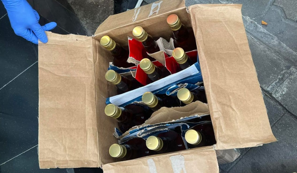 Officers found 64 bottles of alcohol inside boxes the man was carrying at the time of his arrest