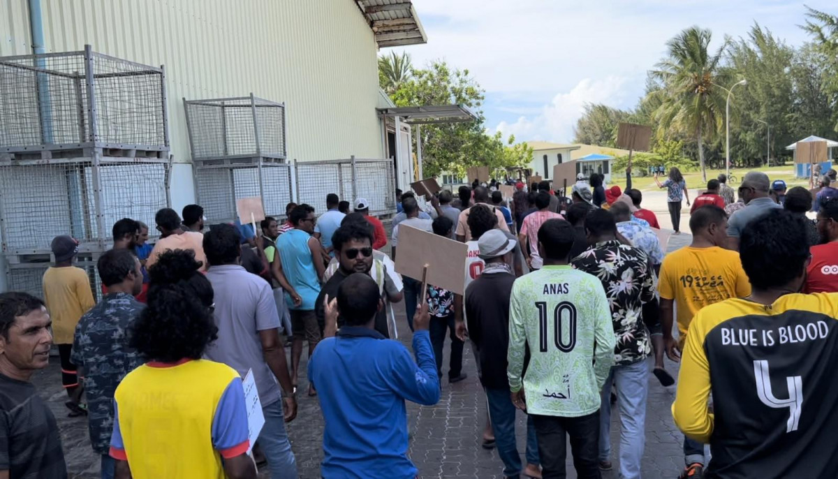 ލ. މާންދޫ މަސް ފެކްޓްރީ ބޭރުގައި މަސްވެރިން މުޒާހަރާ ކުރަނީ