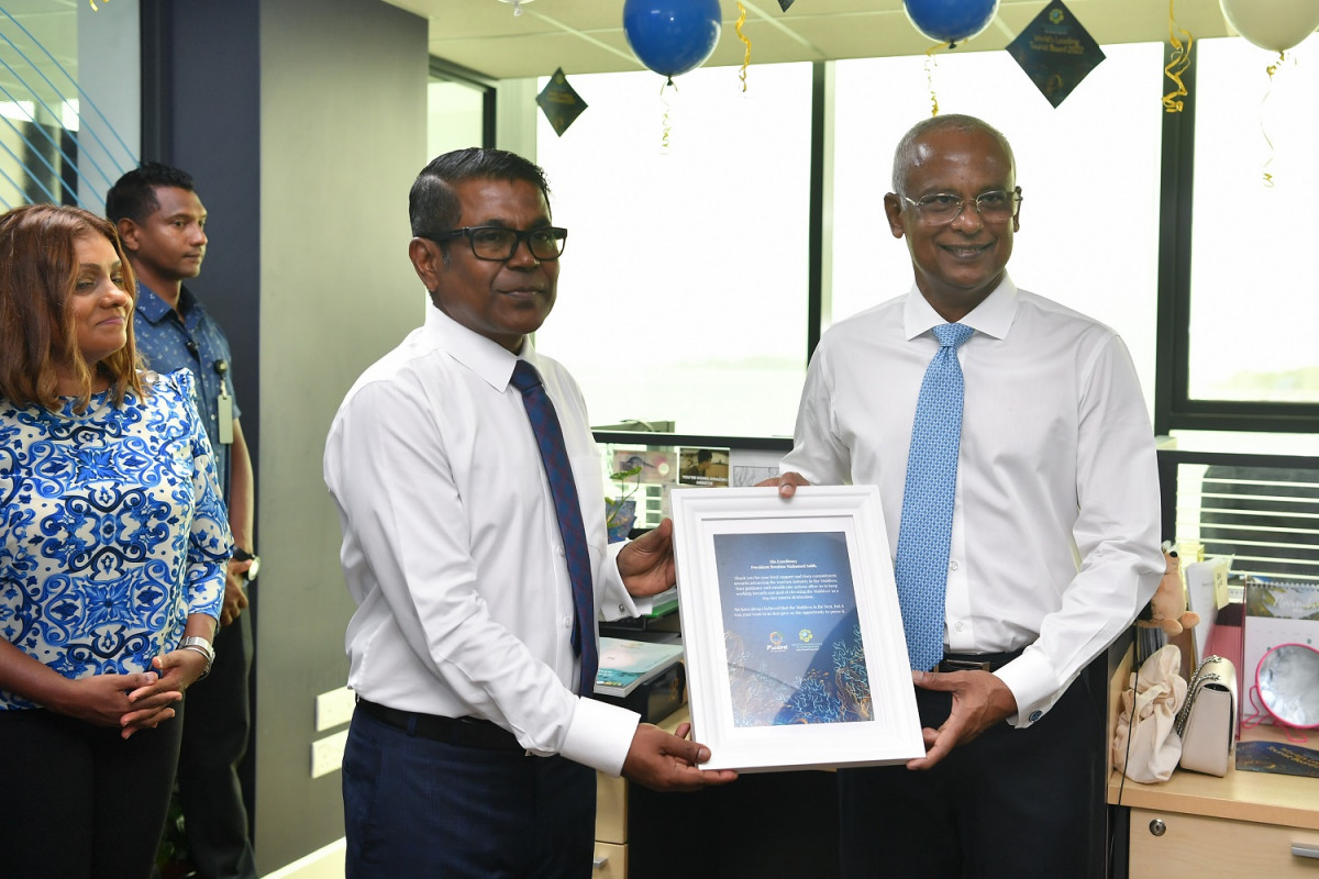 އެމްއެމްޕީއާރްސީގެ މުވައްޒަފުންނަށް ރައީސުލްޖުމްހޫރިއްޔާ ޝުކުރު އަދާކުރެއްވީ މިއަދު ރައީސުލްޖުމްހޫރިއްޔާ އެތަނަށް ޒިޔާރަތްކުރައްވައި، މުވައްޒަފުންނާ ބައްލުކުރައްވައި ވާހަކަފުޅު ދައްކަވަމުންނެވެ. ރައީސުލްޖުމްހޫރިއްޔާގެ ވާހަކަފުޅުގައި ވޯރލްޑް ޓްރެވަލް އެވޯޑްގައި، ވޯރލްޑް ލީޑިންގ ޑެސްޓިނޭޝަން އެވޯޑާއި، ވޯރލްޑް ލީޑިންގް ޓުއަރިސްޓް ބޯޑް އެވޯޑް ރާއްޖެއަށް ލިބިފައިވާތީ އެކަން ޚާއްޞަގޮތެއްގައި ފާހަގަކުރައްވައި، އެމްއެމްޕީއާރްސީގެ ވެރިންނާއި މުވައްޒަފުންނަށް ޝުކުރާއި މަރުޙަބާ ވިދާޅުވިއެވެ. ވޯރލްޑް ލީޑިންޑް ޓްއަރިސްޓް ބޯޑު އެވޯޑް ރައްޖެއަށް ލިބުނު މިއީ ފުރަތަމަ އަހަރެވެ. އަދި، ވޯރލްޑް ލީޑިންގ ޑެސްޓިނޭޝަން އެވޯޑް ރާއްޖެއިން ވަނީ މި އަހަރާއެކު ވިދިވިދިގެން 3 އަހަރު ހޯދާފައެވެ.