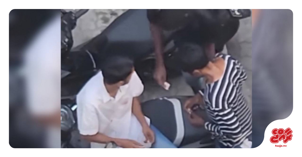 The 40-second video clip shows a man sitting on a parked motorcycle, joined by two others. The man is seen openly handing a packet suspected to be drugs, to another individual who handed him a note of MVR 100.