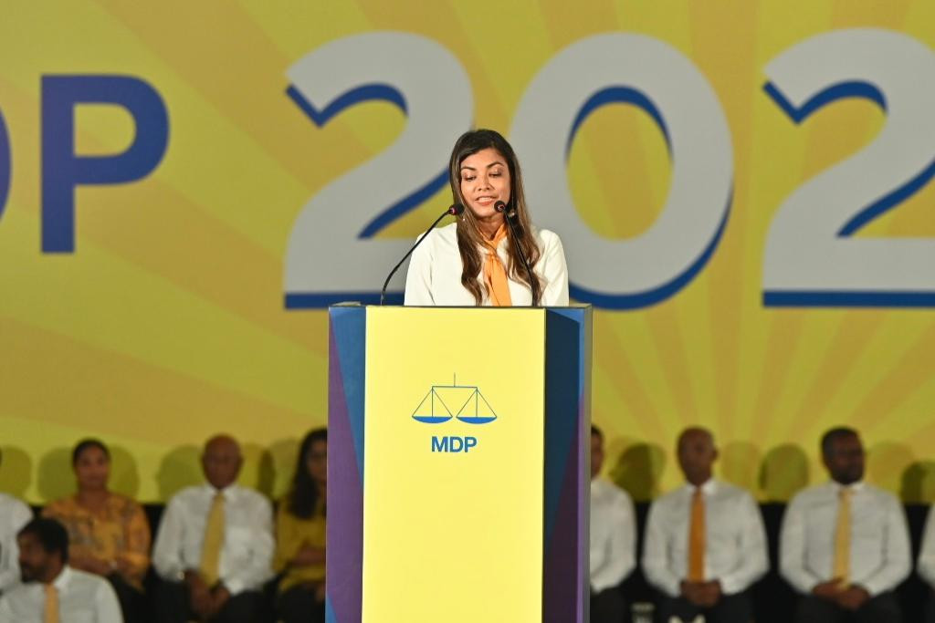 ރައީސް ޞާލިހަށް ރިޔާސީ ޓިކެޓް ހަވާލުކުރުމަށް ބޭއްވި ޖަލްސާގައި މެމްބަރު ރޮޒައިނާ ވާހަކަދައްކަވަނީ