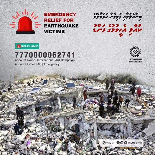 ތުރުކީ-ސީރިއާއަށް އައި ބިންހެލުމާއި ގުޅިގެން، އެތައް މިލިއަން މީހުން ހާލުގައި ޖެހިފައިވާތީ، އެފަރާތްތަކަށް އެހީވުމަށް ރާއްޖޭގައި އިންޓަރނޭޝަނަލް އެއިޑް ކެމްޕޭނުން ހުޅުވާފައިވާ އެކައުންޓަށް ފައިސާ ފޮނުވާއިރު އެއީ އެތަނުގެ އެކައުންޓްކަން ޔަގީންކުރުމަށް އެއް އުއްމަތެކޭ ކެމްޕޭން ޓީމުން އެދިއްޖެއެވެ.