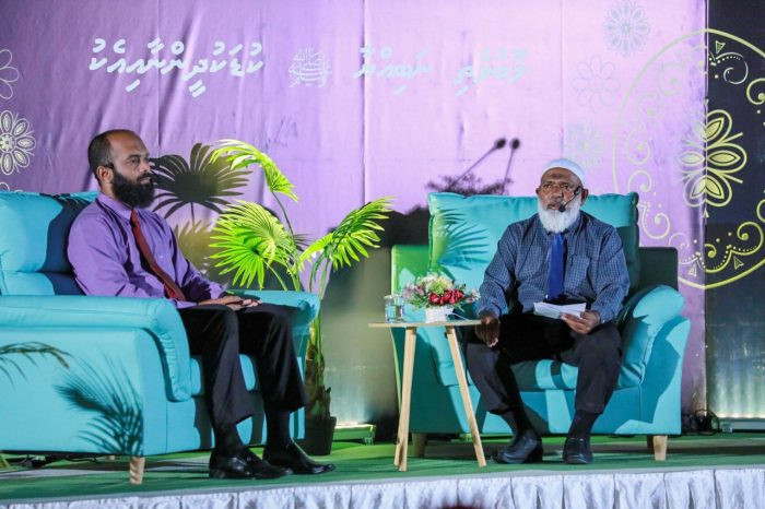 “ލޮބުވެތި ނަބިއްޔާ ﷺ ކުޑަކުދިންނާއެކު” މި މައުޟޫޢަށް ނައިފަރުގައި ތަޤްރީރުކުރެއްވީ އިސްލާމިކް މިނިސްޓްރީގެ ސްޓޭޓް މިނިސްޓަރު އަލްއުސްތާޛް މުޙައްމަދު އަނީލް އަދި އައްޝައިޚް މުޙައްމަދު މޫސާއެވެ.