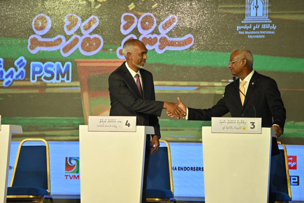 އެ ހިތްދަތި، ބިރުވެރި ދުވަސްތަކަށްފަހު ރައީސް ޞާލިޙު ރައީސްކަމާ ހަވާލުވެވަޑައިގެންނެވީ ގިނަ ކަންކަން ބަދަލު ކުރެއްވުމަށެވެ. އެމަނިކުފާނުގެ ރިޔާސީ މިދައުރު ހަމަވާން ދާއިރު، މިއަދާ ހަމައަށް ވެސް ފެނުނީ މަޑުމައިތިރިކަމާއި، ސުލްހަޔަށް ލޯބި ކުރައްވާ މިންވަރެވެ. އެކަމުގެ ތެރެއިން މި ފަހުން ފާހަގަވީ ރިޔާސީ އިންތިޚާބާ ގުޅުވައިގެން ކުރިއަށް ގެންދިޔަ ރިޔާސީ ބަހުސް އެވެ. ބަހުސް އަށް ރައީސް ޞާލިޙު ސްޓޭޖު މައްޗަށް އަރާވަޑައިގެން، އޭރު ސްޓޭޖުގައި ތިއްބެވި އުމަރު ނަސީރު އަދި ޙަސަން ޒަމީލާ ސަލާމް ކުރެއްވި އެވެ. ރައީސް ޞާލިޙު އެމަނިކުފާނުގެ ޕޯޑިއަމްގައި ހުންނަވަނިކޮށް، ދެން ވަޑައިގެންނެވީ އިދިކޮޅު ޕީއެންސީގެ ކެންޑިޑޭޓު ޑރ.މުޙައްމަދު މުއިއްޒު އަރިހަށެވެ. މުއިއްޒު ވަޑައިގެން އުޅުއްވީ ޕޯޑިއަމް ކައިރީގައި ހުއްޓުމަށެވެ. އިތުރު އެހެން ކަމެއް ކުރުއްވަން އުޅުނު މަންޒަރެއް ނުފެނެ އެވެ. ނަމަވެސް، އެވަގުތު ވެސް ރައީސް ޞާލިޙު ވަނީ އަމިއްލަފުޅަށް އިސްނަންގަވައި، މުއިއްޒުއާ ސަލާމް ކުރެއްވުމަށް އަތް ދިއްކޮށްލެއްވުމަށެވެ. އެއަށްފަހު ދެ ބޭފުޅުން ސަލާމް ކުރެއްވި އެވެ.