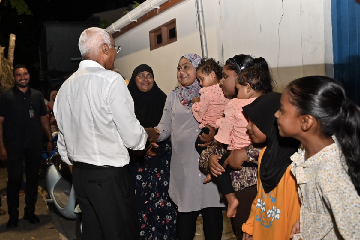 ރައީސް ގެންދަވަނީ ރިޔާސީ އިންތިޚާބުގެ ދެވަނަ ބުރަށް ކެމްޕޭން ކުރެއްވުމުގެ ގޮތުން މާލޭގެ އެކި ސަރަހައްދުތަކުގައި "ދޮރުން ދޮރަށް" ހަރަކާތް ކުރިއަށްގެންދަވަމުންނެވެ. އެގޮތުން އާދީއްތަ ދުވަހު މާފަންނުގެ ބައެއް ސަރަހައްދުތަކުގެ ގެތަކަށް ޒިޔާރަޔްކުރެއްވިއިރު، ހޯމަ ދުވަހު އެމަނިކުފާނު ވަނީ ހެންވޭރު އުތުރު އަދި ދެކުނުގެ ބައެއް ގެތަކަށް ޒިޔާރަތް ކުރައްވާފައެވެ. އަދި އަންގާރަ ދުވަހު އެމަނިކުފާނު ވަނީ މެދު ހެންވޭރާއި ހެންވޭރު ހުޅަނގުގެ ބައެއް ގޭގެއަށް ދޮރުން ދޮރަށް ވަޑައިގަންނަވާފައެވެ. މީގެ އިތުރުން ބުރާސްފަތި ދުވަހު ވަނީ މާފަންނު ހުޅަނގު ދާއިރާގެ ދޮރުން ދޮރަށް ވެސް ވަޑައިގަންނަވާފައެވެ.