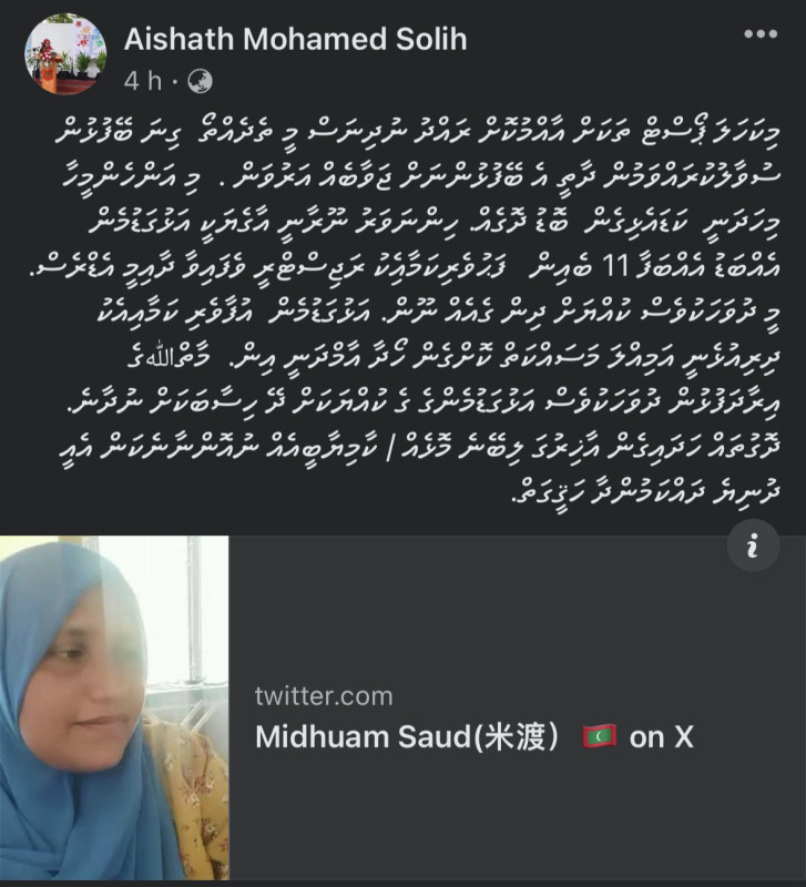 އައިޝަތު މުހައްމަދު ސާލިޙު ލިޔުއްވި ފޭސްބުކް ސްޓޭޓަސް