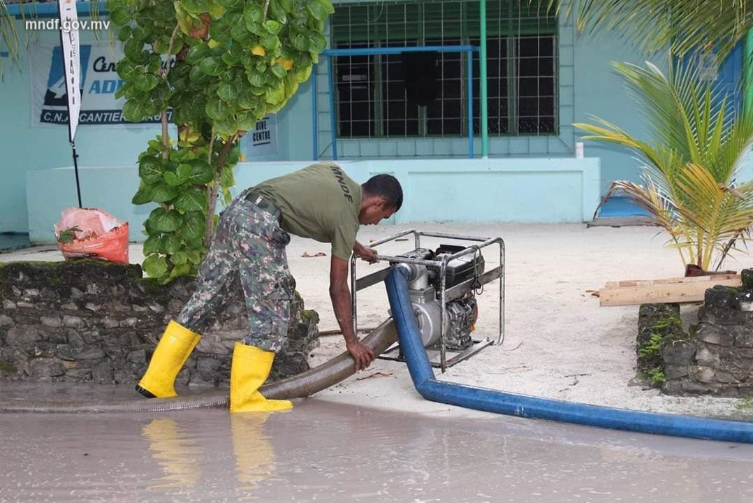 ފެންބޮޑުވެ ގެތަކަށް ފެން ވަދެފައިވާ ކަމުގެ މައުލޫމާތު ލިބުމާއެކު އެމްއެންޑީއެފް މާލެ އޭރިއާ ކޮމާންޑްގެ ސިފައިންނާއި މާލެ ފަޔަރ ސްޓޭޝަންގެ ސިފައިން ފެން ހިއްކުމަށް ބޭނުންވާ ސާމާނާއި، ވެލި ބަސްތާ ޖެހުމަށް ބޭނުންވާ ގޯނިފަދަ ތަކެތި ހިފައިގެން އާދީއްތަ ދުވަހުގެ މެންދުރު 3:15 ހާއިރު އެ ރަށަށް ދިޔަ ކަމަށާއި ފެން ބޮޑުވެފައިހުރި ތިން ސަރަހައްދެއްގައި ޕަންޕު ބޭނުންކޮށްގެން ފެން ހިންދުމުގެ މަސައްކަތް ކުރިއަށް ގެންދިޔަ ކަމަށް އެމްއެންޑީއެފުން ބުންނެވެ.
