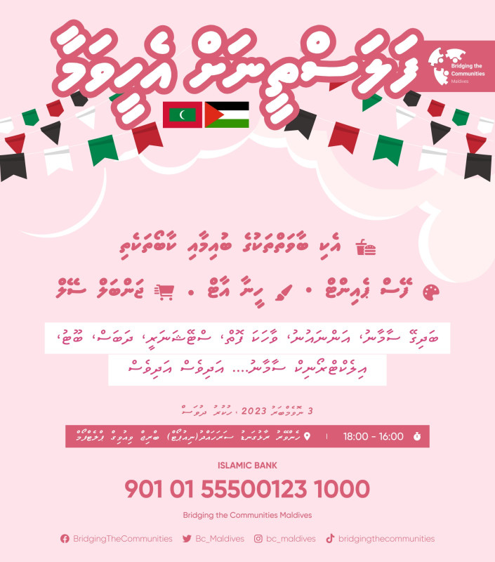 ބްރިޖިންގ ދަ ކޮމިއުނިޓީސް މޯލްޑިވްސް (ބީ.ސީ.އެމް)ގެ ފަރާތުން "ހެލްޕް ފަލަސްތީން" ނަމުގައި އިވެންޓެއް ހުކުރު ދުވަހު ކުރިއަށް ގެންދިޔުމަށް ނިންމާފައިވާ ކަމަށް ބީ.ސީ.އެމްއިން ބުނެފިއެވެ.