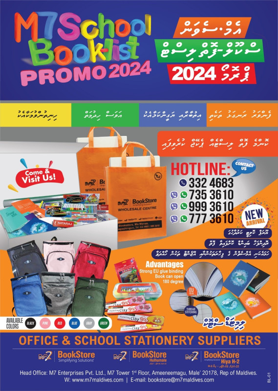 ޕްރިންޓުކުރުމުގެ އިތުރުން ސްޓޭޝަނަރީ އަދި ސްކޫލަށް ބޭނުންވާ ގިނަ ސާމާނުތަކެއް ވިއްކަމުން އަންނަ އަދި ބެލެނިވެރިންގެ މެދުގައި އިތުބާރު ލިބިފައިވާ އެމް7 އިން ބުނީ 2024 ވަނަ އަހަރުގެ ސްކޫލް ފޮތް ލިސްޓަށް ބޭނުންވާ ފޮތްތައް ވީހާވެސް ފަސޭހަ އަދި އަވަސް މިނެއްގައި ލިބޭނެ ގޮތަށް އިންތިޒާމްތައް ރޭވިފައިވާ ކަމަށެވެ.