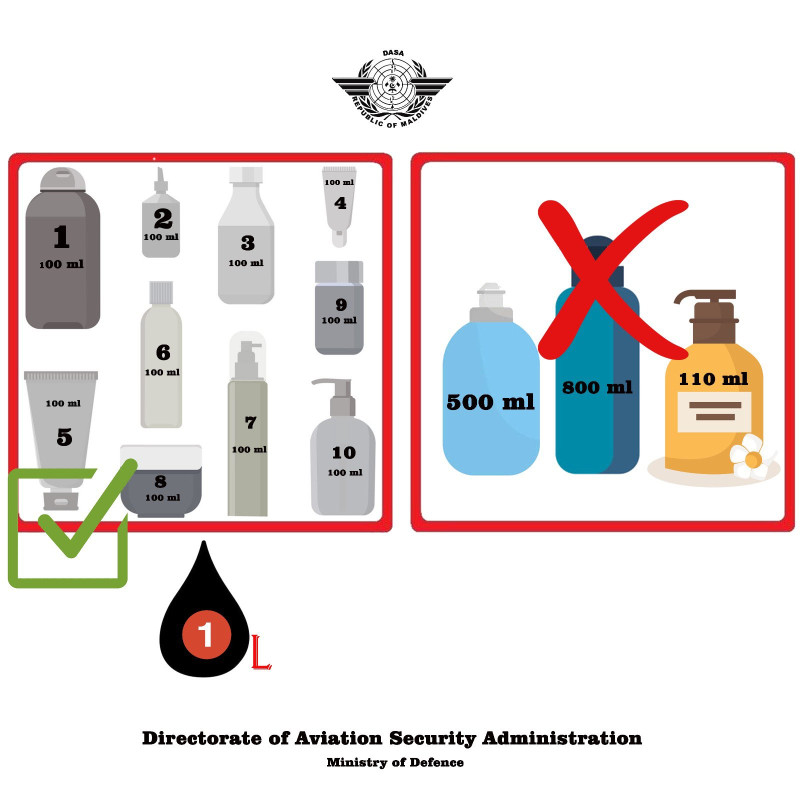 އެގޮތުން ދިޔާތަކެތި އަޅާފައި ހުންނަ ކޮންޓެއިނަރ 100 އެމްއެލް އަށް ވުރެ ގިނަ ނުކޮށް ކަމަށާއި ފަސިންޖަރަކަށް ގެންދެވޭނީ ގިނަވެގެން 100 އެމްއެލްގެ 10 ކޮންޓެއިނަރު އަދި ދަތުރު މަތީގައި ބޭނުންވާ ވަރަށް ކުޑަކުދިންގެ ދިޔާ ކާނާ އަދި ޑޮކްޓަރީ ބޭސް ގެންދެވޭނެ ކަމަށް ބުނެފައިވެއެވެ.