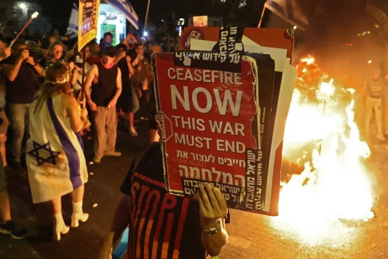 މުޒާހަރާ ކުރި މީހުން ބޮޑުވަޒީރު ނަތަންޔާހޫ އާ ދެކޮޅަށް ޝުއޫރު ފާޅު ކުރަމުން ގޮވަމުން ދިޔައީ ބޮޑު ވަޒީރު އިސްތިއުފާ ދިނުމަށާއި، އައު އިންތިޚާބެއް އިޒްރޭލުގައި އަވަހަށް ބޭއްވުމަށް. ގާޒާ ގައި އިޒްރޭލުން ހިންގަމުންދާ ހަނގުރާމައިގެ ކަންކަން ދާ ގޮތުން ނަތަންޔާހޫ އާ މެދު ހިތްހަމަ ނުޖެހުން ފާޅު ކުރަން ކޮންމެ ހަފްތާއަކު ކަހަލަ ގޮތަކަށް އިޒްރޭލުގައި ބޮޑެތި މުޒާހަރާތައް ކުރޭ.