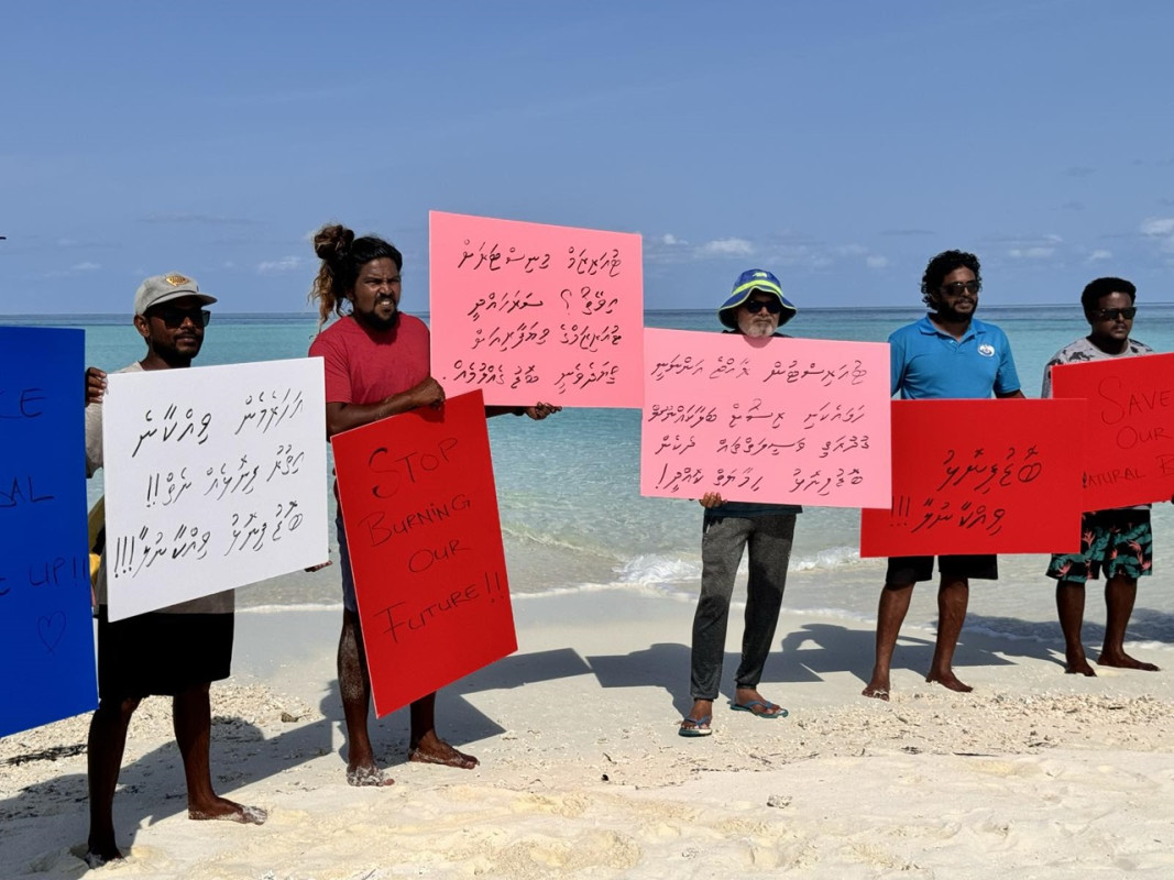 The protest was staged on the sandbank, by members of the Vaavu atoll council, tourism entrepreneurs as well as members of the general public employed in the sector and others.