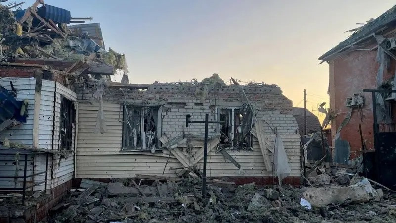 ރަޝިޔާ-ޔުކްރެއިން ހަނގުރާމައިގެ ތެރޭގައި، ޔުކްރެއިން ސިފައިން ދިން ހަމަލާއަކުން ސުންނާފަތިވެފައިވާ ގެއެއް ދައްކުވައިދޭ މަންޒަރެއް