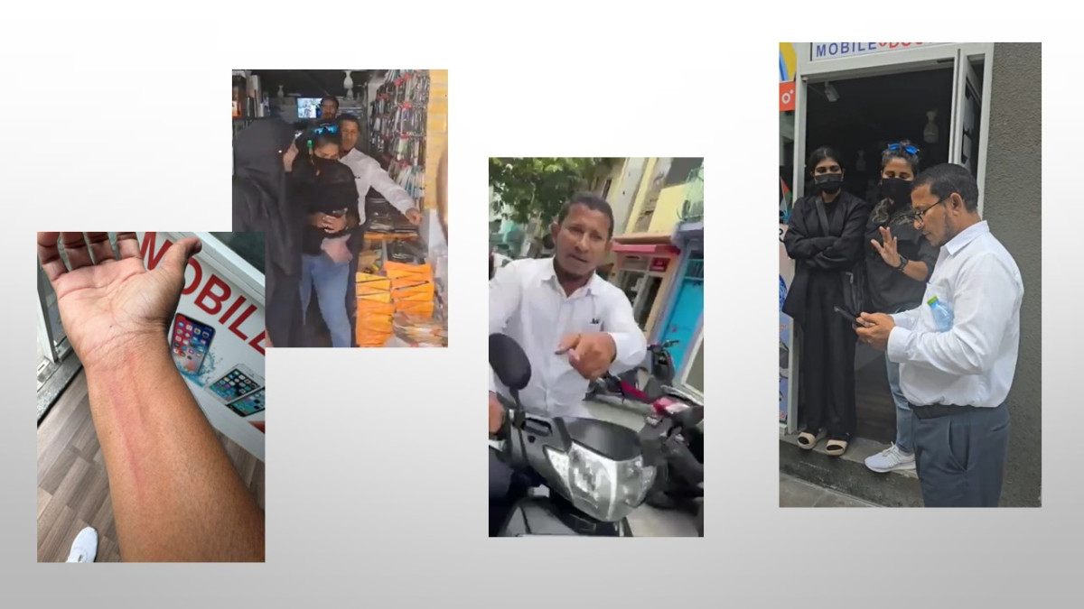 މި ވީޑިއޯގައި އެ ފިހާރަައިގެ ތެރޭގައި ތިބި ދެ އަންހެނުންނާއި ދިމާލަށް "ގައިގައިވެސް އަތްލެވޭނެ" ކަމަށާއި، "ގައިގައި އަތްލާފައި ދައްކަންވީތަ" ބުނާ އަޑު އިވެއެވެ. އަދި އެތަނުން އެތެރޭގައި ހުރި އަންހެން މީހާގެ ގައިގައި ޖެހިގަނެ އޭނާ ކޮށްޕާ ފިހާރައިން ބޭރުކޮށް ދޮރުލައްޕަން އުޅޭތަން ފެނެއެވެ.