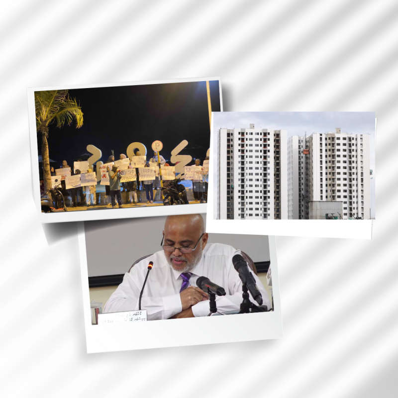 ހައުސިން މިނިސްޓަރު ޑރ.އަލީ ހައިދަރާއި، ފްލެޓުތަކުގެ މައްސަލާގައި މުޒާހަރާ ކުރާ ބައިވެރިން