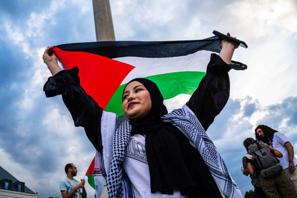 ފަލަސްތީނަށް ތާއީދު ކޮށް ބޭއްވި މުޒާހަރާ އެއްގައި އަންހެނަކު ފަލަސްތީނުގެ ދިދަ ހިފައިގެން