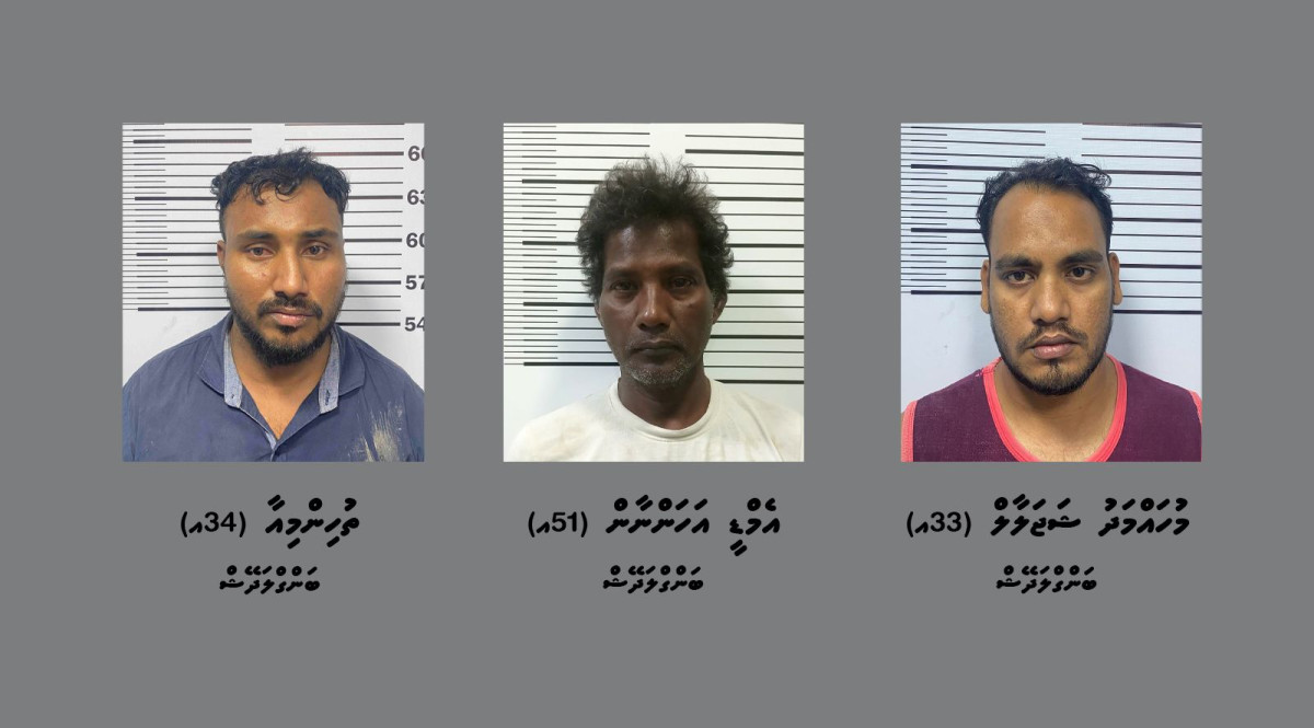 ހުޅުމާލޭ އޮޕަރޭޝަނުގައި ފުލުހުން ބަނގުރަލާއެކު ހައްޔަރުކުރި ކަމަށް ބުނާ 3 މީހުން. ފޮޓޯ: ޕޮލިސް މީޑިއާ