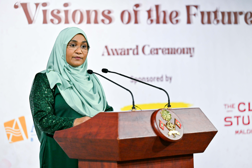 "ވިޝަންސް އޮފް ދަ ފިއުޗަރ" ކުރެހުމުގެ މުބާރާތުގެ އިނާމު ދިނުމުގެ ރަސްމިއްޔާތުގައި ރައީސްގެ އަނބިކަނބަލުން ސާޖިދާ މުހައްމަދު ވާހަކަފުޅު ދައްކަވަނީ