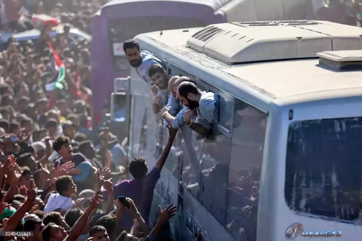 އިސްރާއީލުގެ ޖަލުތަކުން ދޫކޮށްލި ފަލަސްތީނުގެ މީހުން ޚާން ޔޫނިސްގައި ހުންނަ ނާސިރު ހޮސްޕިޓަލުގެ ސަރަހައްދަށް ބަސްތަކުގައި ގެންނަނީ