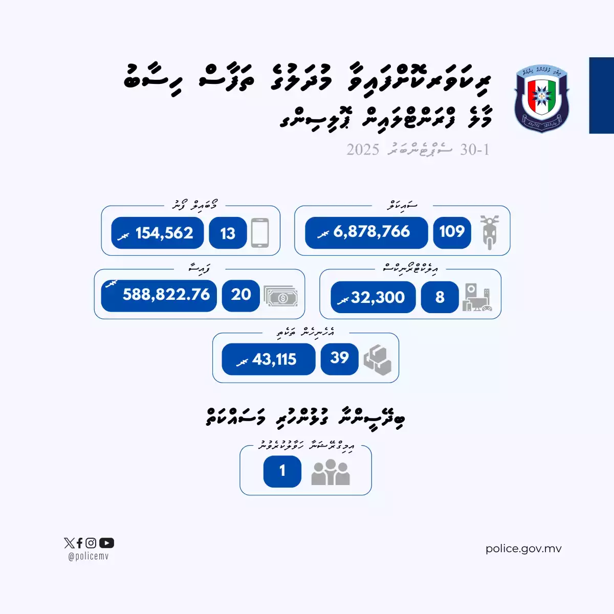އެގޮތުން މިދިޔަ މަހު ފުލުހުން ރިކަވާ ކުރި މުދަލުގެ ތަފާސްހިސާބުތަކަށް ބަލާއިރު، 109 ސައިކަލެއް ހޯދާފައިވެއެވެ. އެއީ 6،878،766 ރުފިޔާއެވެ. 13 މޯބައިލް ފޯނު ހޯދާފައިވާއިރު، އެއީ 154،562 ރުފިޔާއެވެ. މީގެ އިތުރުން 32،300 ރުފިޔާ ހިމެނޭ 8 ބާވަތެއްގެ އިލެކްޓްރޯނިކްސް ސާމާނު ހޯދާފައިވާއިރު، 20 ކޭސްއާ ގުޅޭ 588،822.76 ރުފިޔާ ހޯދާފައިވެއެވެ. އަދި 39 އެހެނިހެން މައްސަލައާ ގުޅުންހުރި 43،115 ރުފިޔާ ހޯދާފައިވާ ކަމަށް ފުލުހުން ބުނެއެވެ.