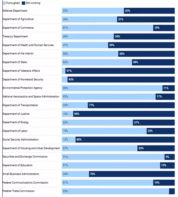 އަނެއްކޮޅުން ސެކިއުރިޓީ އެންޑް އެކްސްޗޭންޖް ކޮމިޝަން (އެސްއީސީ)ގެ 4،300 މުވައްޒަފުންގެ ތެރެއިން 91 އިންސައްތަ މުވައްޒަފުން ވަނީ މުސާރަ ނުލިބޭ ގޮތަށް ގެއަށް ފޮނުވާލެވިފަ އެވެ. އަދޮ އެންވަޔަރަންމަންޓަލް ޕްރޮޓެކްޝަން އޭޖެންސީގެ 15،000 މުވައްޒަފުންގެ 89 އިންސައްތަ މުވައްޒަފުން ވަނީ މުސާރަ ނުލިބޭ ގޮތަށް ގެޔަށް ފޮނުވާލެވިފަ އެވެ. ހަމަ އެހެންމެ، ޑިޕާޓްމަންޓް އޮފް އެޑިއުކޭޝަންގެ 2،450 ސަރުކާރު މުވައްޒަފުންގެ 87 އިންސައްތަ މުވައްޒަފުން ވަނީ މުސާރަ ނުލިބޭ ގޮތަށް ގެޔަށް ފޮނުވާލެވިފައިވެ އެވެ.