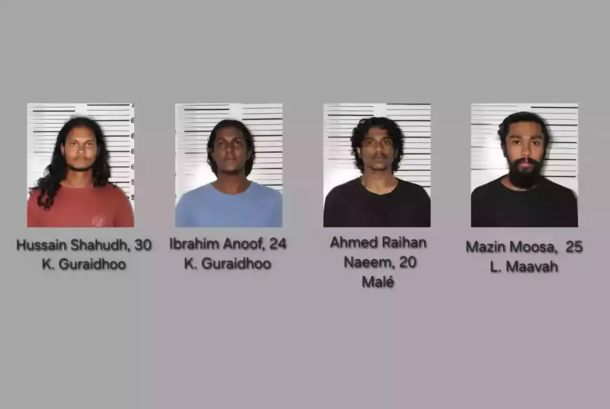Those arrested have been identified as Mazin Moosa, 25, from Reysham in Maavah island of Laamu atoll; Ahmed Raihan Naeem, 20, from M. Choras, Malé City; Ibrahim Anoof, 24, from Alhivilaage in Guraidhoo island of Kaafu atoll; and Hussain Shahudh, 30, also from Alhivilaage in Guraidhoo island of Kaafu atoll.
