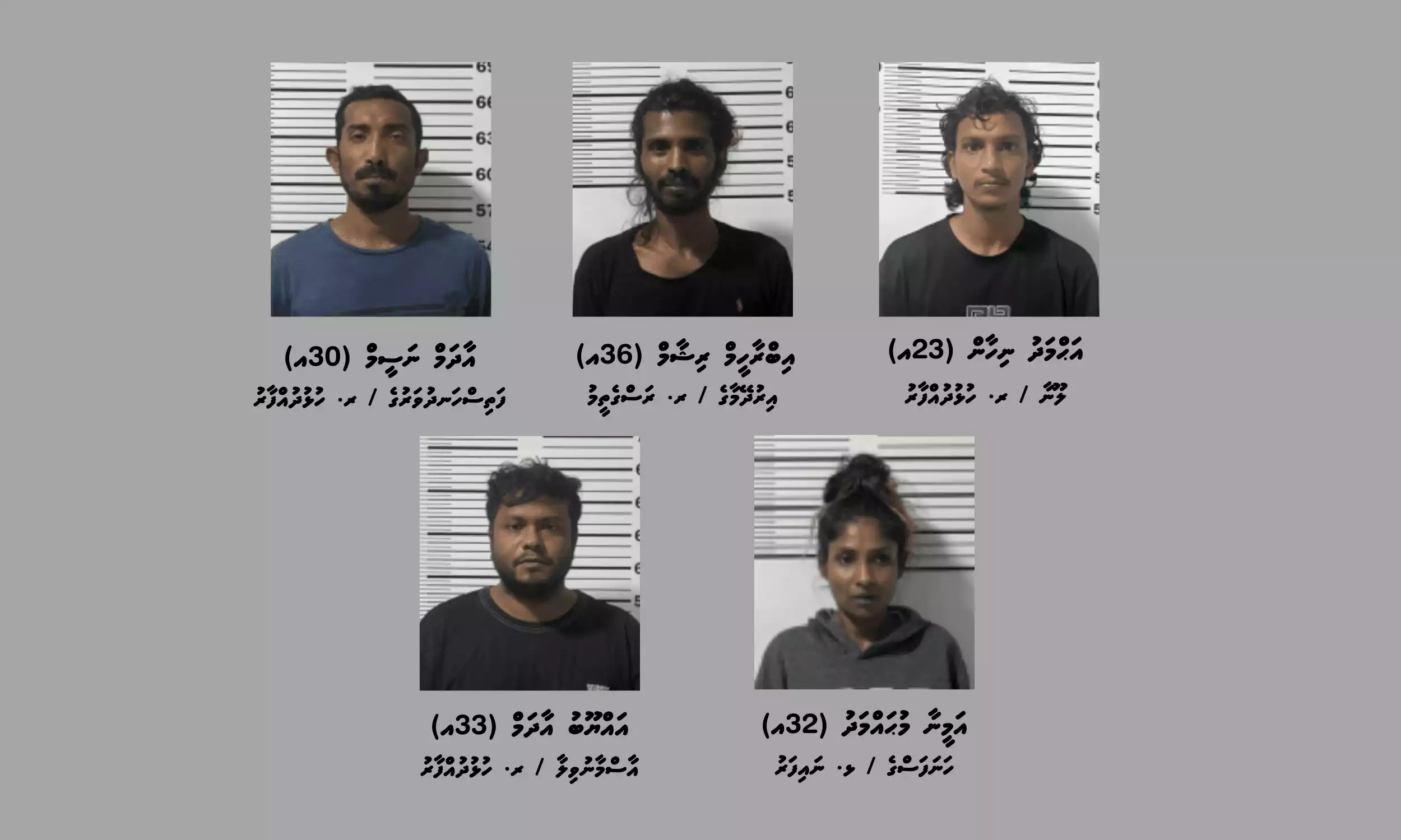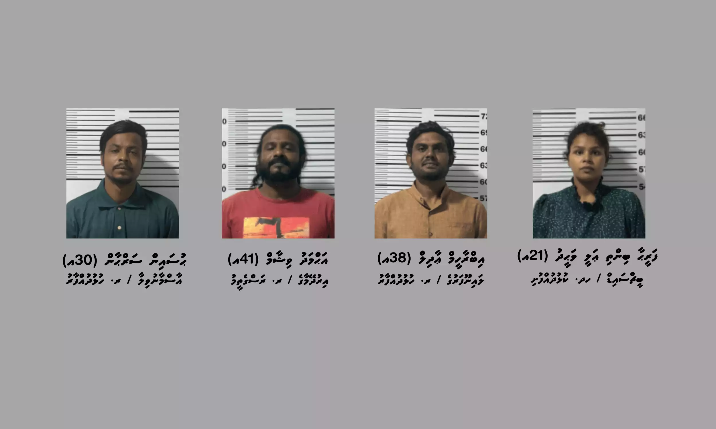 މި މައްސަލައާ ގުޅިގެން ހައްޔަރުކޮށްފައިވަނީ ރ. ހުޅުދުއްފާރު / ލޫނާ، އަޙްމަދު ނިހާން (23އ) އާއި، ރ. ރަސްގެތީމު / އިރުދޭމާގެ، އިބްރާހީމް ރިޝާމް (36އ) އާއި، ރ. ހުޅުދުއްފާރު / ފަތިސްހަނދުވަރުގެ، އާދަމް ނަސީމް (30އ) އާއި، ޅ. ނައިފަރު / ހަނަފަސްގެ، އަމީނާ މުހައްމަދު (32އ) އާއި، ރ. ހުޅުދުއްފާރު / އާސްމާނުވިލާ، އައްޔޫބު އާދަމް (33އ) އާއި، ހދ. ކުޅުދުއްފުށި / ބީޗްސައިޑް، ފަރީހާ ބިންތި އަލީ ވަހީދު (21އ) އާއި، ރ. ހުޅުދުއްފާރު / ލައިނޫފަރުގެ، އިބްރާހީމް އާދިލް (38އ) އާއި، ރ. ރަސްގެތީމު / އިރުދޭމާގެ، އަހްމަދު ވިޝާމް (41އ) އާއި، ރ. ހުޅުދުއްފާރު / އާސްމާނުވިލާ، ހުސައިން ސަރްހާން (30އ) އެވެ.