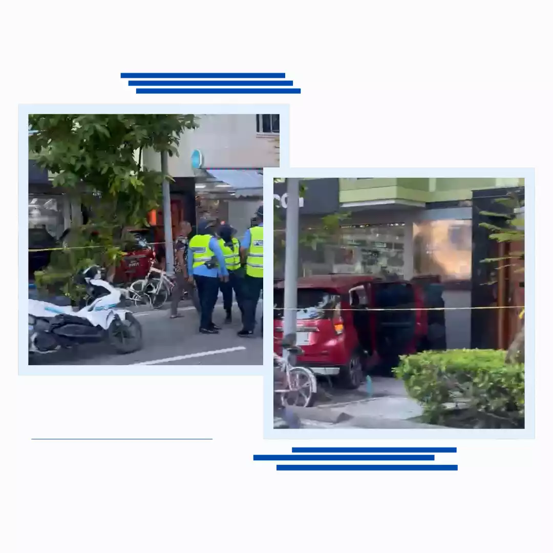 According to the police institution, the incident occurred around 6am on 8 November 2025, along Nirolhu Magu in Hulhumalé Phase I. The car, reportedly attempting to avoid an oncoming vehicle, collided with a motorcycle before veering off course and crashing into a storefront.