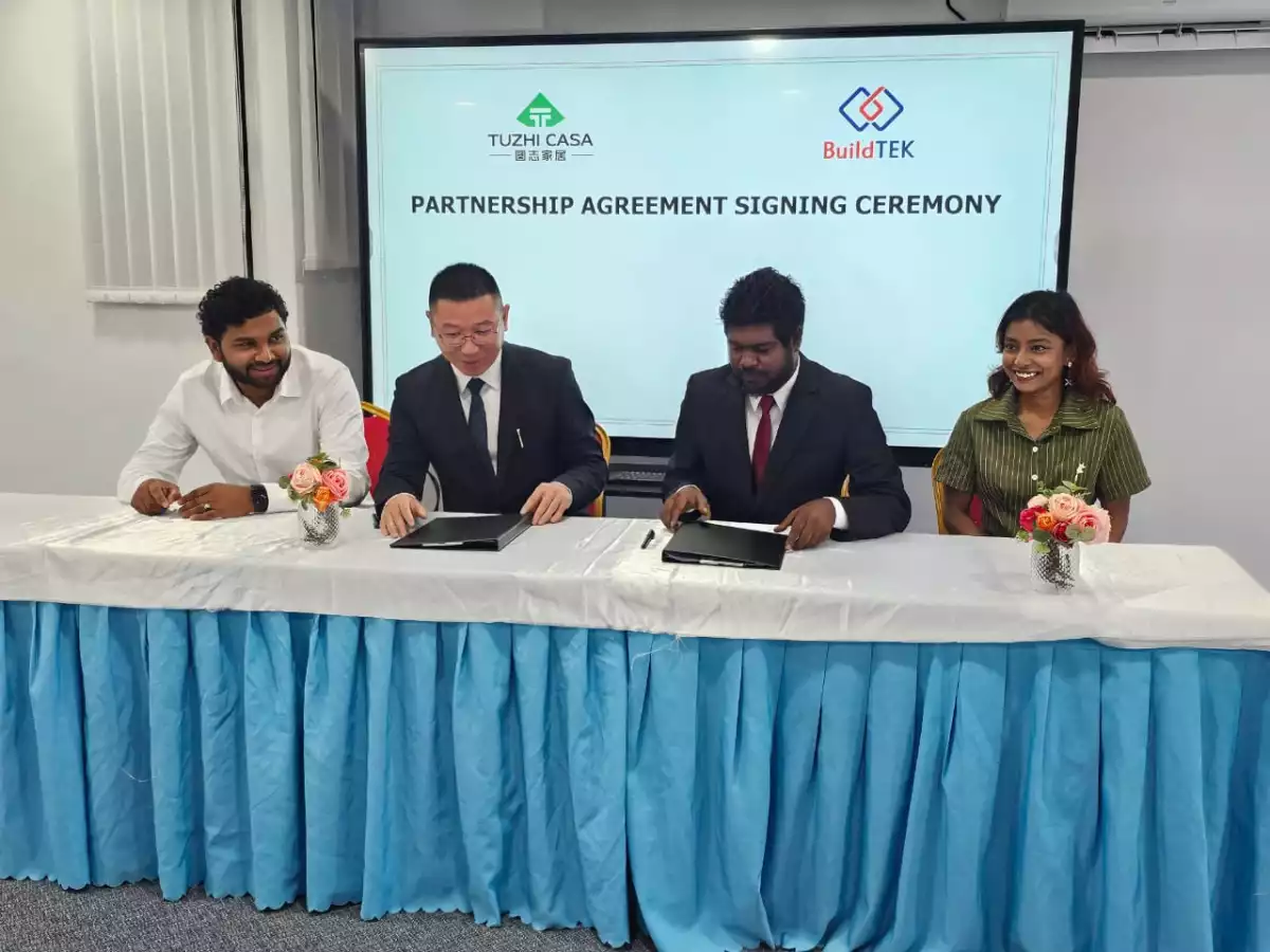 The agreement was signed during a ceremony held on Tuesday morning. Signing on behalf of their respective companies were Frank Zheng, CEO of Tuzhi Casa, and Ali Fayaaz, Director of BuildTEK Private Limited.