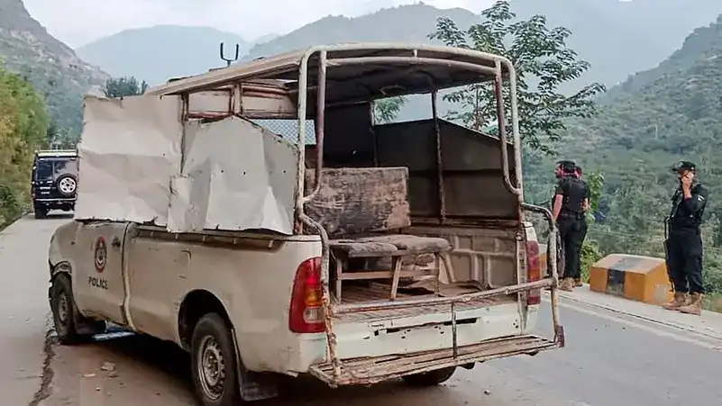 ސެޕްޓެމްބަރު 22، 2024 ގައި ޚައިބަރު ޕަޚްތުންޚުވާ ޕްރޮވިންސްގެ ސްވަޓް ޑިސްޓްރިކްޓްގެ މަލާމް ޖަބާގައި ބޮމެއް ގޮއްވާލި ތަނުގައި ހަލާކުވެފައިވާ ފުލުހުންގެ އުޅަނދެއް ކައިރީގައި، ތަހުގީގު ކުރިއަށް ދަނީ (ފައިލް)