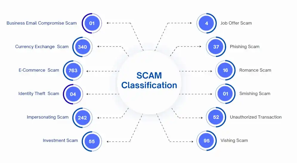 އެންމެ ގިނަ ބަޔަކު ހުށަހެޅިފައިވަނީ އީ ކޮމާސް ސްކޭމް ކުރިން ފާހަގަކުރިހެން ޚާއްސަ ގޮތެއްގައި ފޭސްބުކް މާކެޓުގައި 763 ސްކޭމް. ދެވަނަ އަށް ބޭރުގެ ފައިސާ ގަނެވިއްކުމުގެ ގުޅުންހުރި ސްކޭމްތައް 340 މައްސަލަ. މިއާއެކު ކާކުކަން ނޭނގޭ ގޮތަށް 242 މައްސަލައެއް، ފޯނުން ގުޅައިގެން 95 މައްސަލައެއް، އިންވެސްޓްމަންޓް ސްކޭމްގެ 55 މައްސަލަ، ލިންކް މެދުވެރިކޮށް 37 ސްކޭމްގެ މައްސައެއް، ރޮމާންސް ސްކޭމް ނުވަތަ ލޯބީގެ ގޮތުން ގުޅުމެއް އުފައްދައިގެން ހިންގާފައިވާ 16 މައްސަލައެއް. ވަޒީފާގެ ފުރުސަތު އޮފަރކޮށްގެން ހިންގާފައިވާ 4 މައްސަލައެއް. އައިޑެންްޓިޓީ ތްފެޓްގެ 4 މައްސަލައެއް. ބިޒްނަސް އީމެއިލް ކޮންޕްރަމައިޒް ސްކޭމްގެ 1 މައްސަލައެއް ފާހަގަކުރެވިފައިވޭއިންސްޕެކްޓަރ އޮފް ޕޮލިސް ޝާމް މުހައްމަދު