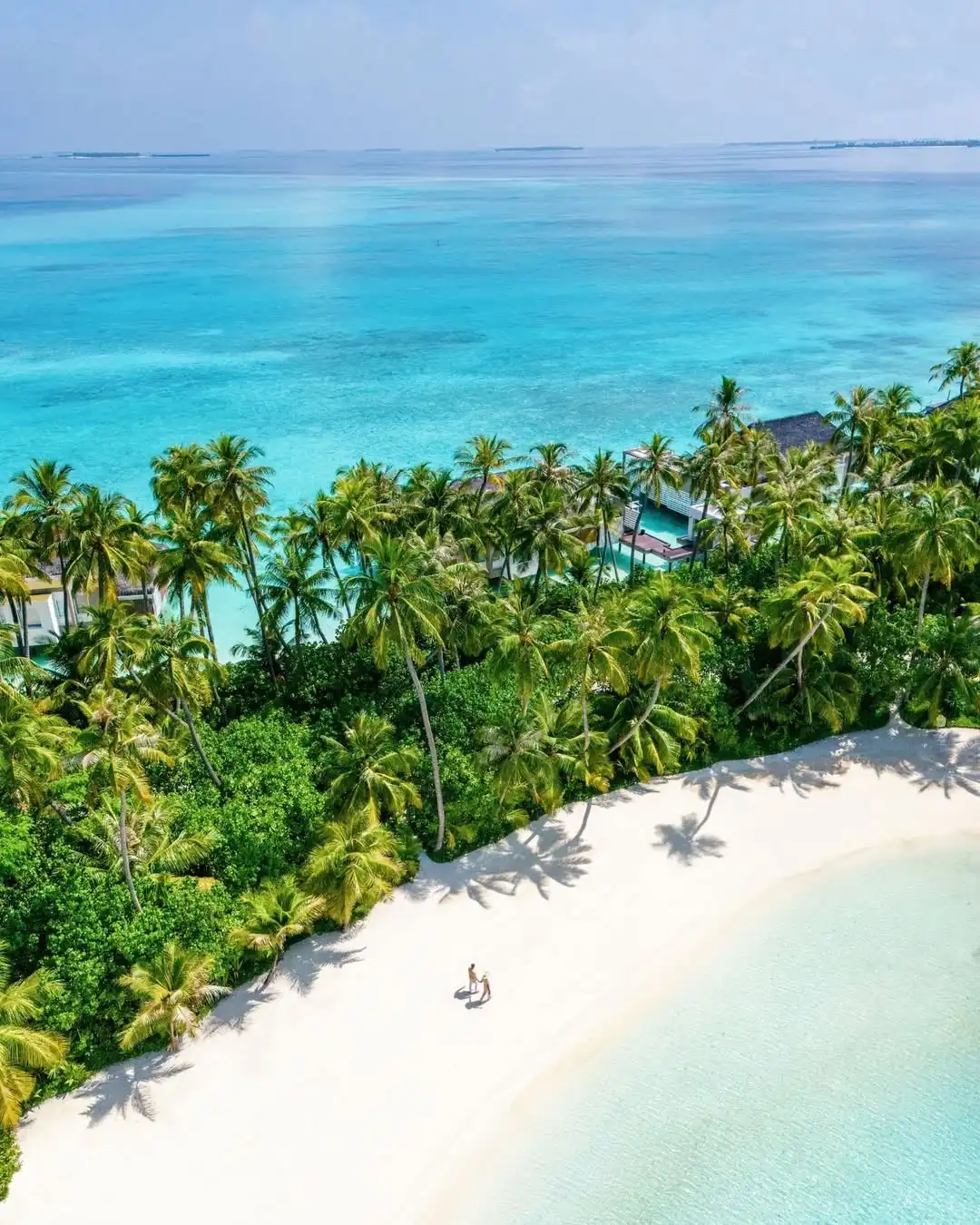 Aerial view of Cheval Blanc Randheli shows a stretch of white sand beach bordered by palm trees and turquoise lagoon waters, with overwater villas visible in the background. Tourists walk hand-in-hand along the shoreline during the peak tourist season in the Maldives.