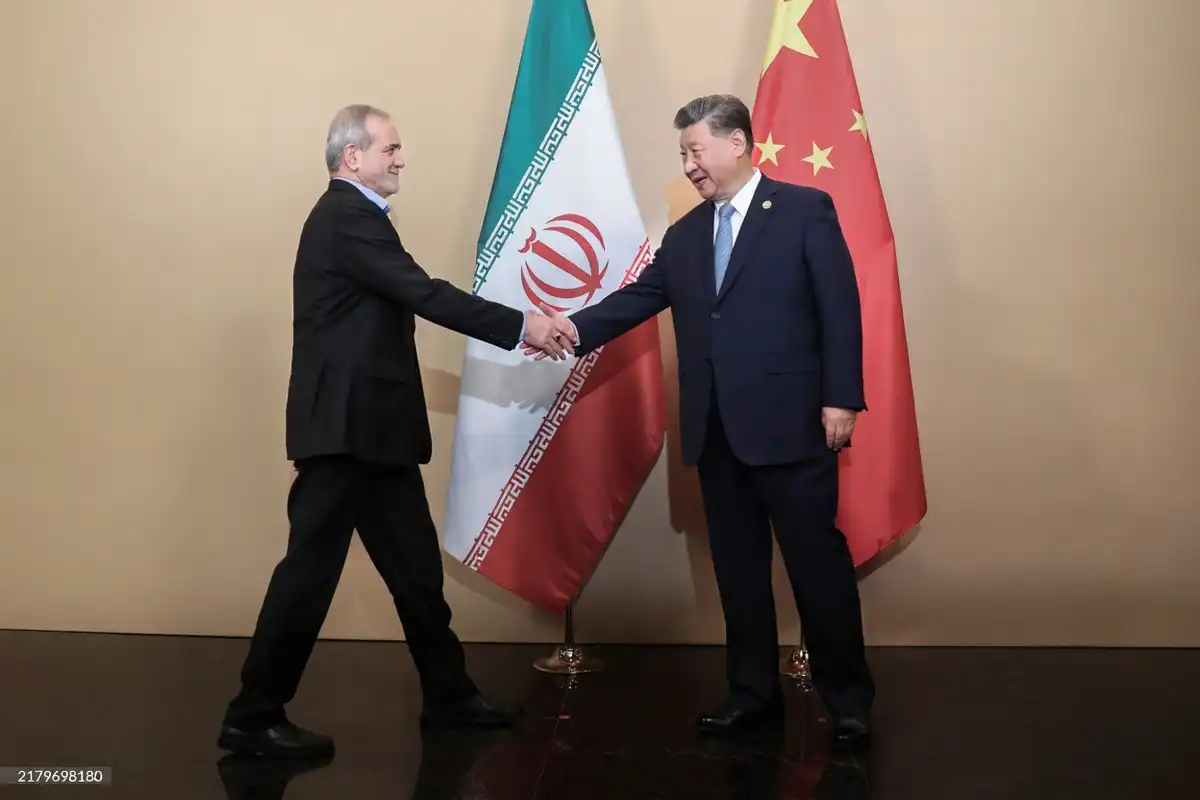 ޗައިނާގެ ރައީސް ޝީ ޖިންޕިން (ކ) އާއި އީރާނުގެ ރައީސް މަސޫދު ޕެޒެޝްކިއަން ރަޝިޔާ ގައި އޮތް 16 ވަނަ ބްރިކްސް ސަމިޓް ގެ ތެރޭގައި ސަލާމް ކުރައްވަނީ - އޮކްޓޯބަރު 23, 2024 | ގެޓީ އިމޭޖަސް