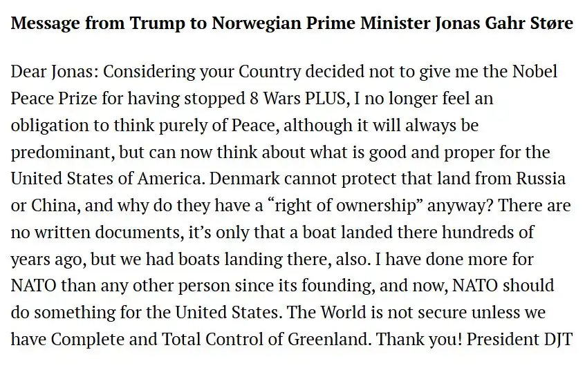 މީގެ އިތުރުން، އެމެރިކާގެ ބާރުގެ ދަށަށް ގްރީންލޭންޑް ނުގެނެވޭހާ ހިނދަކު ދުނިޔެ އަށް ސަލާމަތްތެރިކަމެއް ނެތް ކަމަށް ވެސް ޓްރަމްޕް އެ މެސެޖުގައި ފާހަގަކުރައްވާފައިވެ އެވެ. "ގްރީންލޭންޑްގެ ފުރިހަމަ އަދި މުޅި ކޮންޓްރޯލް އަހަރެމެންނަށް ނުލިބޭހާ ހިނދަކު، ދުނިޔެ އަކީ ރައްކާތެރި ތަނެއް ނޫން،" ޓްރަމްޕް ވިދާޅުވި އެވެ.