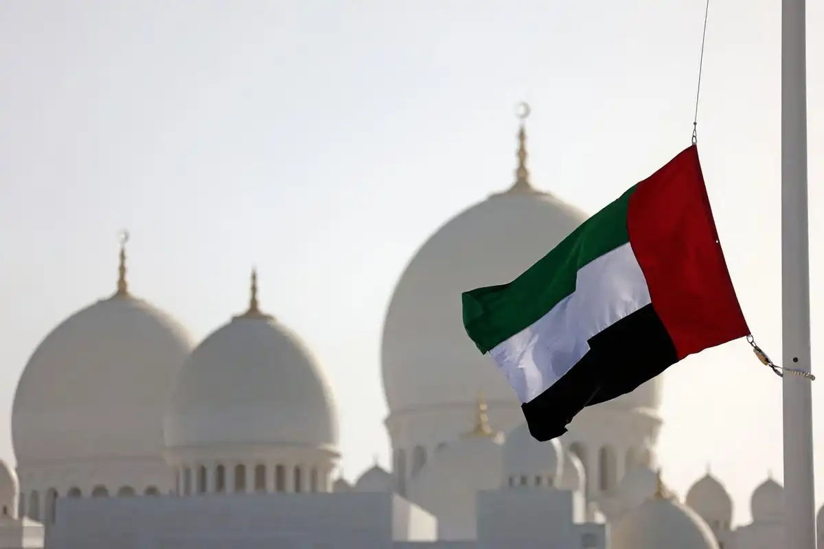 އަބޫދާބީގެ ޝައިހް ޒައިދު މިސްކިތުގެ ބޭރުގައި ޔޫއޭއީގެ ދިދަ ފެންނަ މަންޒަރެއް. | ގެޓީ އިމޭޖަސް