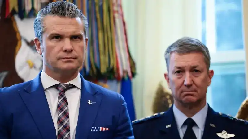 ވައިޓް ހައުސްގައި ބޭއްވި ބައްދަލުވުމެއްގެ ތެރެއިން، އެމެރިކާގެ ސެކްރެޓަރީ އޮފް ޑިފެންސް ޕީޓް ހެގްސެތް އާއި ޖޮއިންޓް ޗީފްސްގެ ޗެއާ ޖެނެރަލް ޑެން ކޭން. | ރޮއިޓާސް
