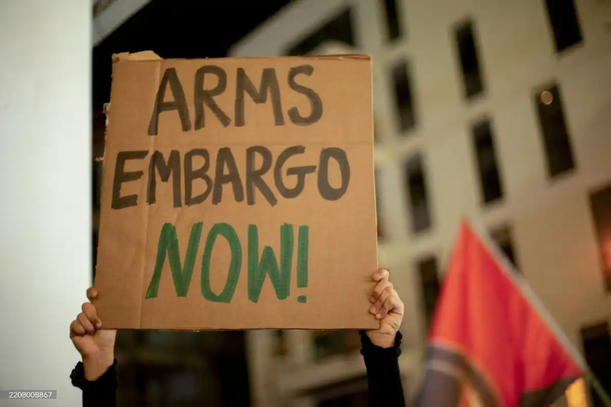 އިޒްރޭލުގެ ތަލް އަވީވްގައި ހުންނަ އެމެރިކާ އެމްބަސީ ކުރިމަތީގައި 2024 ނޮވެމްބަރު 20 ވީ ބުދަ ދުވަހު ކުރިއަށްދިޔަ މުޒާހަރާގެ ބައިވެރިއަކު، "މިހާރުން މިހާރަށް ހަތިޔާރު ފޯރުކޮށްދިނުން ހުއްޓާލާ!" ލިޔެފައިވާ ކާޑުބޯޑު ބޯޑެއް ހިފަހައްޓައިގެން. | ގެޓީ އިމޭޖަސް