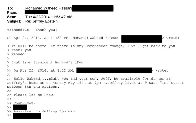 އޭޕްރީލް 22، 2014 ގައި އެޕްސްޓީންގެ ފަރާތުން ޑރ. ވަހީދަށް ފޮނުވާފައިވަ އީމެއިލެއް ގައި "މެއި މަހުގެ 19 ވާ ހޯމަ ދުވަހުގެ ރޭގަނޑު 7:00 ގައި ޖެފްރީގެ ގޭގައި އޮންނަ ރޭގަނޑުގެ ކެއުމަކަށް ވަހީދާއި ދަރިފުޅު ޖެފް އަށް ވަޑައިގެންނެވިދާނެތޯ،" އަހާފައިވެ އެވެ.