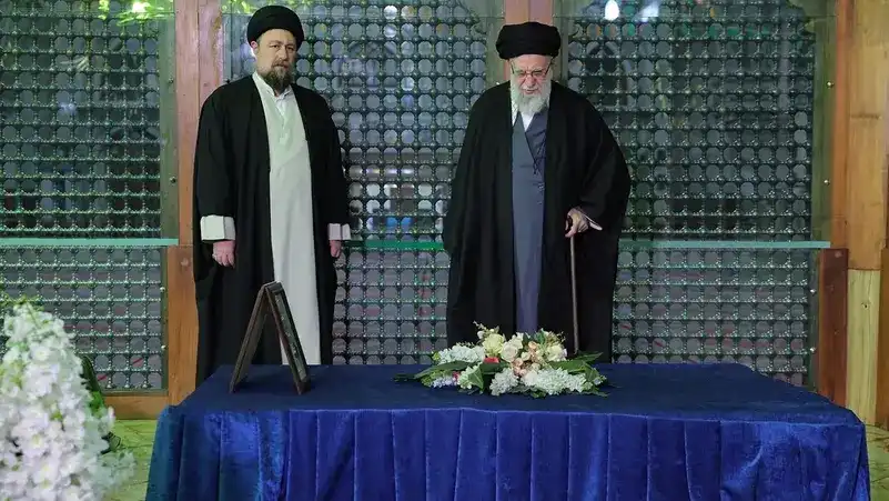އީރާނުގެ ރޫހާނީ ލީޑަރު އާޔަތުﷲ އަލީ ޚާމަނާއީ އާއި، އެ ގައުމުގެ 1979 ވަނަ އަހަރުގެ އިސްލާމީ އިންގިލާބުގެ ބާނީ ރޫހުﷲ ޚުމައިނީގެ ކާފަދަރިކަލުން ހަސަން ޚުމައިނީ، ޚުމައިނީގެ މަގުބަރާ އަށް ޒިޔާރަތްކުރެއްވުން. | ރޮއިޓާސް