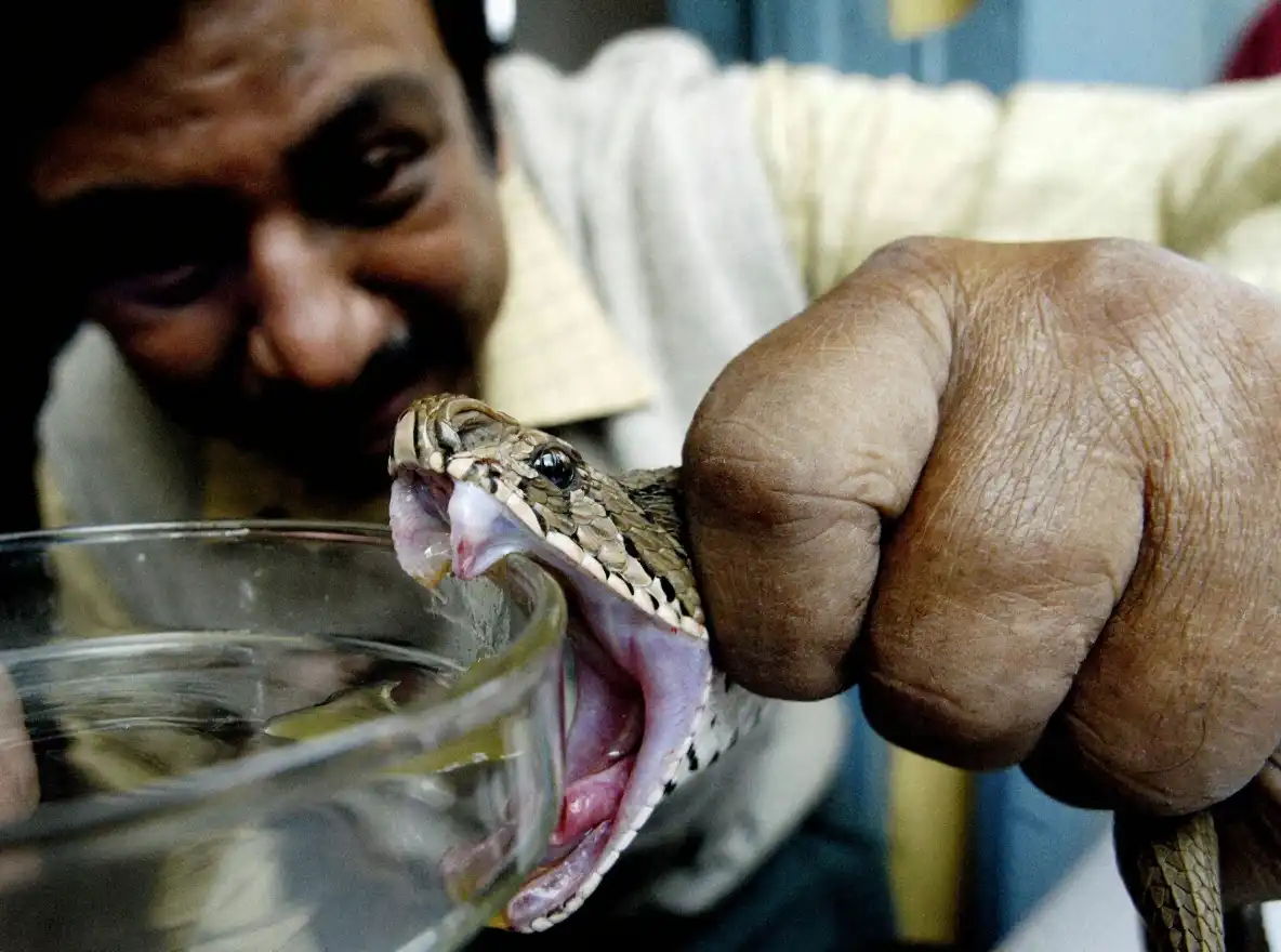 ކަލްކަތާގައި ހުންނަ ބެންގޯލް ކެމިކަލް އެންޑް ފާމަސޫޓިކަލް ކޮމްޕެނީގައި، ހަރުފަ ވިހައަށް ފަރުވާދޭ އެންޓި-ވެނަމް ތައްޔާރުކުރުމަށްޓަކައި، އިންޑިއާގެ ހަރުފަ ހިފުމުގެ މާހިރެއް ކަމަށްވާ ދީޕަކް މިތުރާ "ޗަންދްރާ ބޯޑާ" (ރަސެލްސް ވައިޕާ) ހަރުފައެއްގެ ވިހަ ނަގަނީ - ޑިސެމްބަރު 6، 2003. | ގެޓީ އިމޭޖަސް