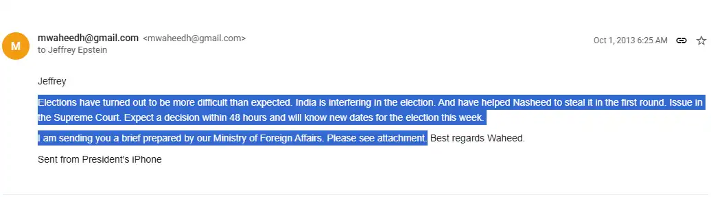 އޭރުގެ ރައީސް ޑރ. ވަހީދު ޖެފްރީ އެޕްސްޓީން އަށް ފޮނުއްވި އީމެއިލެއް ގައި އިންތިޚާބުގެ މައްސަލަ ސުޕްރީމް ކޯޓަށް ހުށަހެޅިފައިވާ ކަން ހިއްސާ ކުރެއްވި ކަމާއި ފޮރިން މިނިސްޓްރީގެ ރިޕޯޓެއް އެޕްސްޓީން އަށް ފޮނުއްވި ކަން ވެސް ވަނީ ހާމަވެފައި. މި އީމެއިލަކީ އިންތިޚާބުގެ ފުރަތަމަ ބުރު ބާތިލުކޮށް، ސުޕްރީމް ކޯޓުގެ ނުފޫޒާއެކު އިންތިޚާބުގެ ތާރީޚުތަކަށް ބަދަލު އައި ދުވަސްވަރު ފޮނުއްވާފައިވާ މެސެޖެއް.